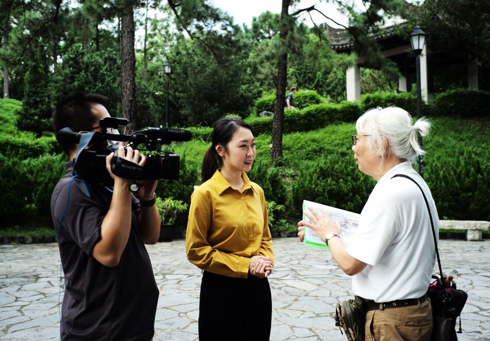 在九龍寨城公園,“波叔”吳力波(右)接受記者訪問。新華社記者 李鋼 攝