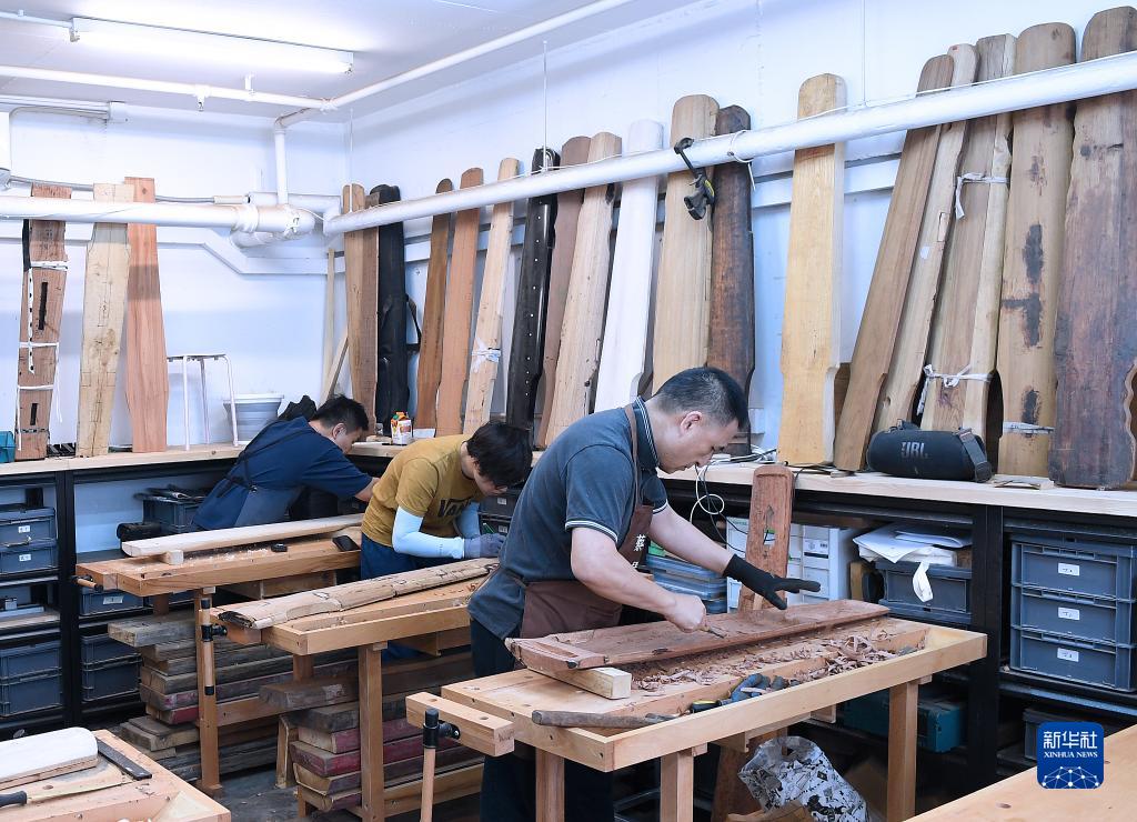 10月7日,徒弟們在工作室里制作古琴。 新華社記者 陳鐸 攝