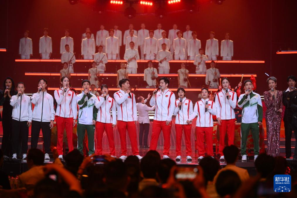 晚会上,多位载誉归来的中国奥运健儿亮相。樊振东、全红婵、冯紫琪以及王柳懿、王芊懿携手港澳运动员代表,向明年即将在粤港澳三地联合主办的第十五届全运会送上祝福。多才多艺的健儿们也一展歌喉。
