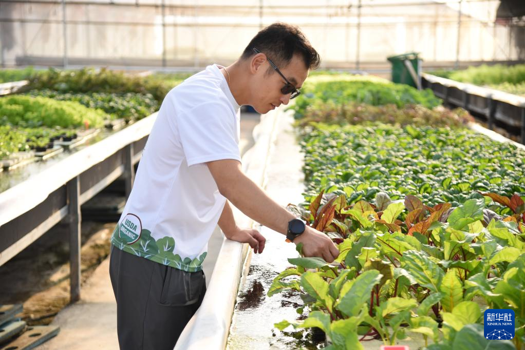 澳门青年孙振鸿在位于广东珠海的农场内查看蔬菜长势(2024年11月28日摄)。 新华社记者 洪泽华 摄