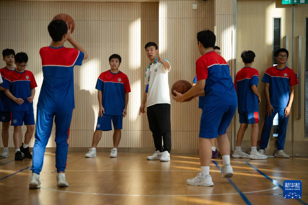 11月12日,澳门中华总商会附设青洲中学体育老师梁骏朗带领学生进行篮球训练。新华社发(张金加摄)