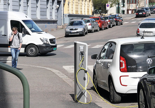 在挪威首都奧斯陸,一輛電動汽車在路邊停放并充電