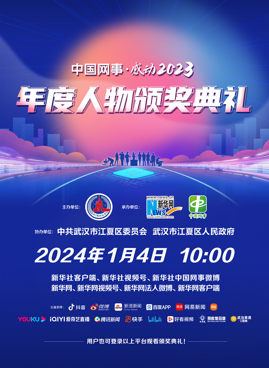 新华网武汉1月2日电(张潘)“中国网事·感动2023”年度人物颁奖典礼将于1月4日全网播出。届时,根据公众投票和专家评审打分加权排名得出的2023年度十大网络感动人物结果将向大众公布。