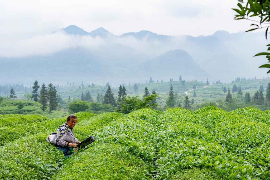 5月15日,茶农在贵州省江口县怒溪镇骆象村的茶园里采收抹茶茶青。