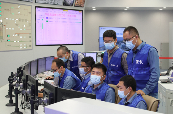 该项目是利用高温气冷堆蒸汽系统引出的高温蒸汽,将换热器里的水加热成高温水,高温水流向市政和电站力能区的换热站进行二次换热后,成为居民供暖热水。