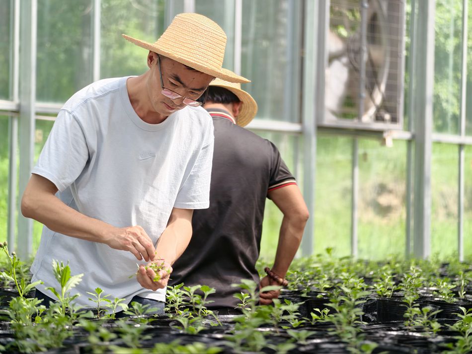 7月11日,青海省西宁市湟中区共和镇苏尔吉村,青海省林业和草原局选派的驻村工作队员张磊(左一)正在给金丝皇菊除草。新华网记者 钟奕 摄