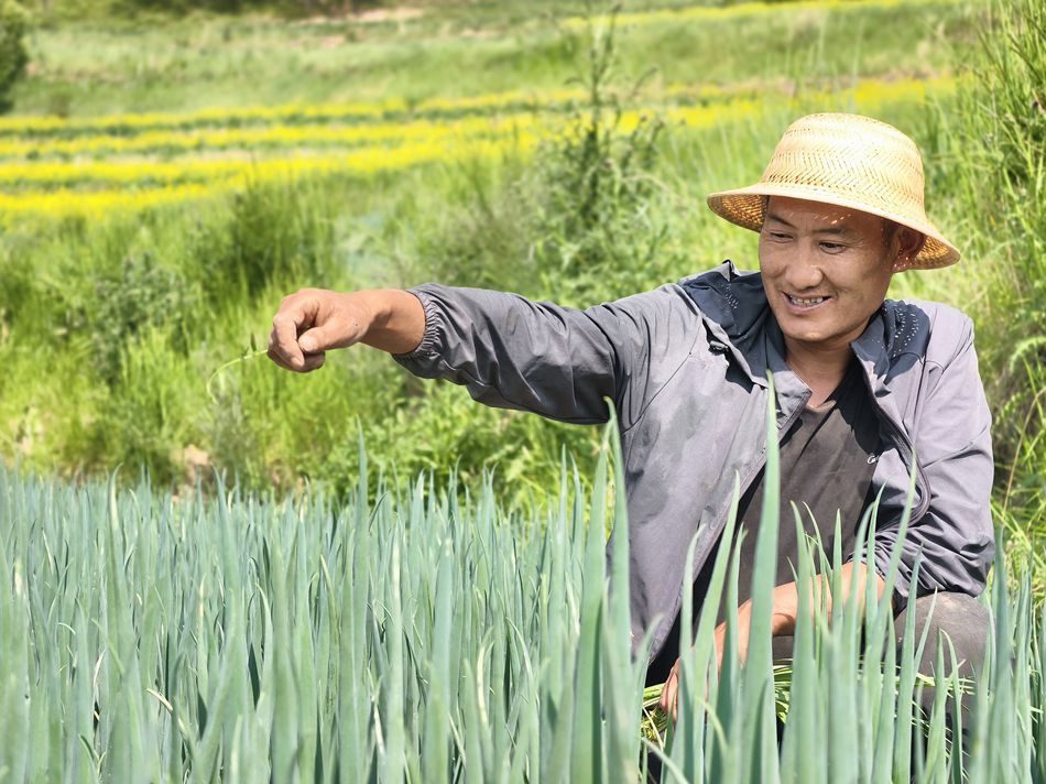 7月11日,青海省西宁市湟中区共和镇苏尔吉村,村民正在给无公害大葱除草。新华网记者 钟奕 摄