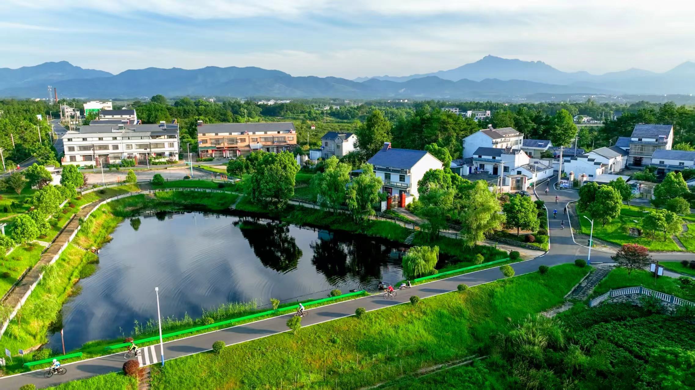 走进安徽省安庆市潜山市黄铺镇黄铺村,仿佛步入一幅清新秀美的山水画卷。一栋栋白墙灰瓦的“新皖派”民居错落有致,一条条水泥路蜿蜒贯通全村,栅栏围起的当家塘碧波荡漾,丘陵上的经济林随风轻曳。公交车直通村内,整个村庄被绿树繁花环抱,处处洋溢着宁静与和谐。