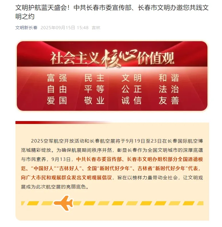作为全国文明城市“五连冠”城市,为确保2025长春航空展期间秩序井然,在长春航空展前夕,中共长春市委宣传部、市精神文明建设办公室发出倡议,号召市民以“文明东道主”的姿态,从自身做起,从细节做起,共同打造一届精彩、圆满、难忘的航空盛会。