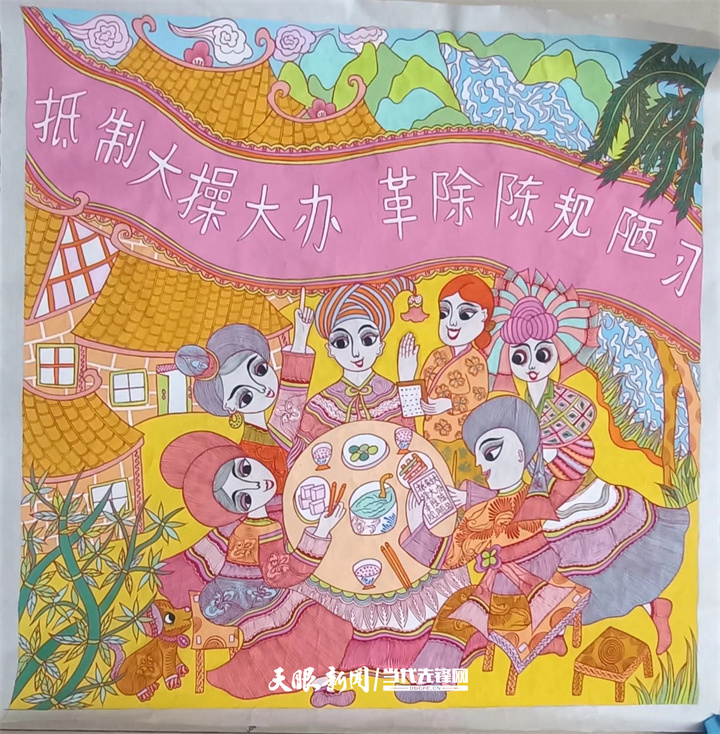 “这幅画画的就是‘抵制大操大办,革除陈规陋习’。”在熊师提展示的画作中,推进移风易俗成为创作的新题材。