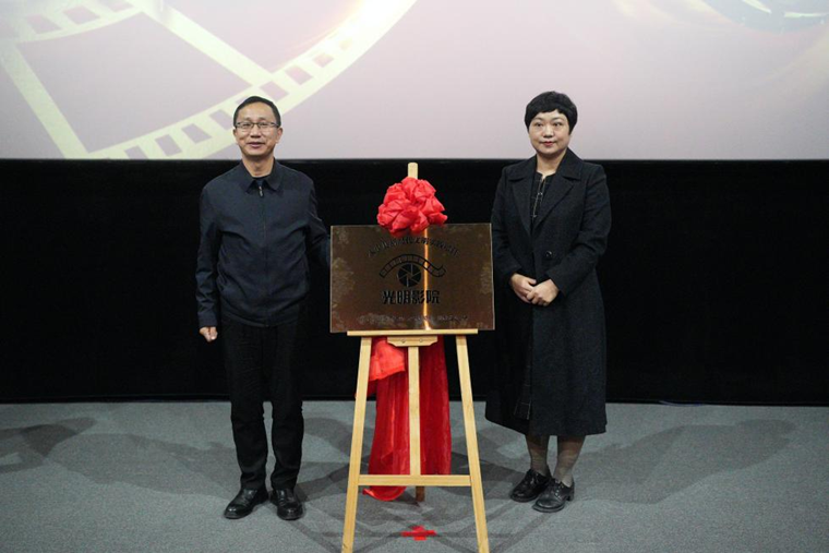宁夏回族自治区党委宣传部文明实践处处长李莉和永宁县委常委、组织部部长马玉祥为永宁县“光明影院”文明实践项目揭牌。王佳佳 摄