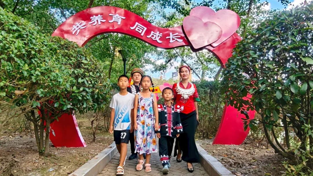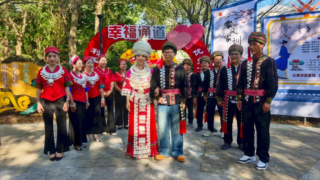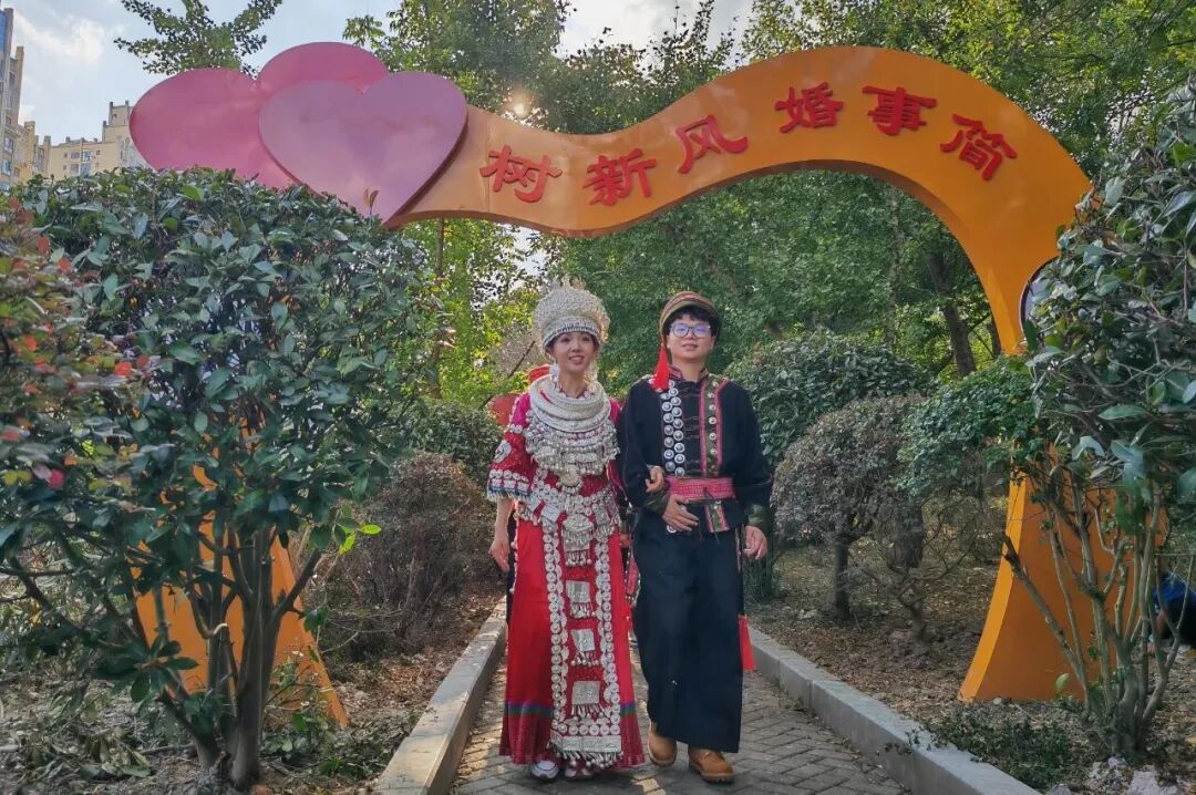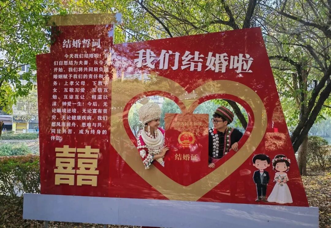 走进“姻缘之门”、婚育文化角”,仿佛穿越时光长廊。青石板铺就的小径旁,雕塑群生动还原了苗族等婚嫁礼仪,新颖温馨的“结婚证书”,为情侣们打造了极具文化韵味的浪漫打卡地,在沉浸式体验中感受传统婚俗文化的独特魅力,重现了“十里红妆”的盛景。“带孩子来了解传统婚俗,比单纯讲典故更有感染力。”家住县城的市民彭芳带着女儿驻足良久,手机里存满了孩子与雕塑互动的照片。