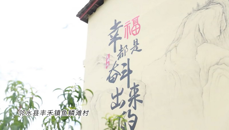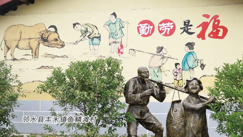 在四川省广安市邻水县丰禾镇鱼鳞滩村,大洪河碧波潺潺,河岸观光带绿树红花相映成趣;整洁村道上,早起村民相遇问候,笑意漾在脸上。广场中央,高大的“福”字雕塑沐浴金光,与村庄的安宁祥和融为一体。