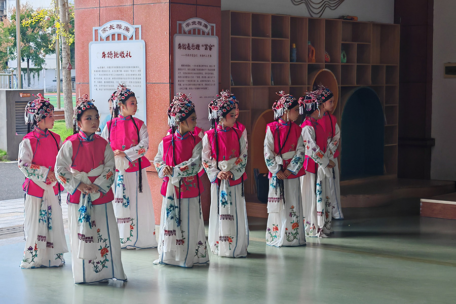在常德市武陵区第一小学的戏曲课堂上,孩子们脸带彩妆身着戏服,在戏曲老师的带领下表演唱段。木雕室内,传出阵阵“沙沙”声,同学们手握刻刀,在桃源木雕非物质文化遗产代表性传承人朱德元的指导下,一根根形状各异的小木头逐渐展现出新生命。该校打造了非遗课程体系,涵盖桃绣、木雕、版画、木工、陶艺、戏曲、丝弦、扬琴、古筝、琵琶、茶艺等10余个非遗项目。