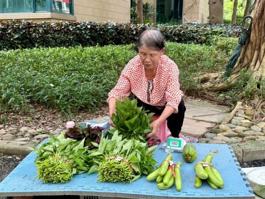 摊主谢秀华笑着说:“我一般早上七点就来摆摊,这些都是自己种的农家菜,就为方便小区的阿姨们来买。”她顿了顿,语气里带着自豪:“我们卖的不仅是菜,更是信任。每天看到菜被拿光、钱也一分不少,真的特别开心。”