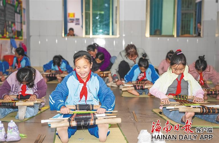 日前,在五指山市第二小学课堂上,语文教师给学生们讲述黎族民间故事和黎锦背后的文化传说;美术教师指导学生们绘制黎锦纹样,从色彩搭配到图案寓意细致讲解黎族传统美学;黎锦非遗代表性传承人手把手指导学生们用织机将设计纹样织成黎锦……