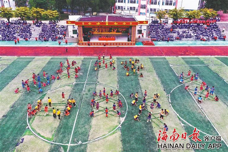 海南省农垦实验中学附属五指山思源实验学校学生在跳竹竿舞。通讯员 张江英 摄