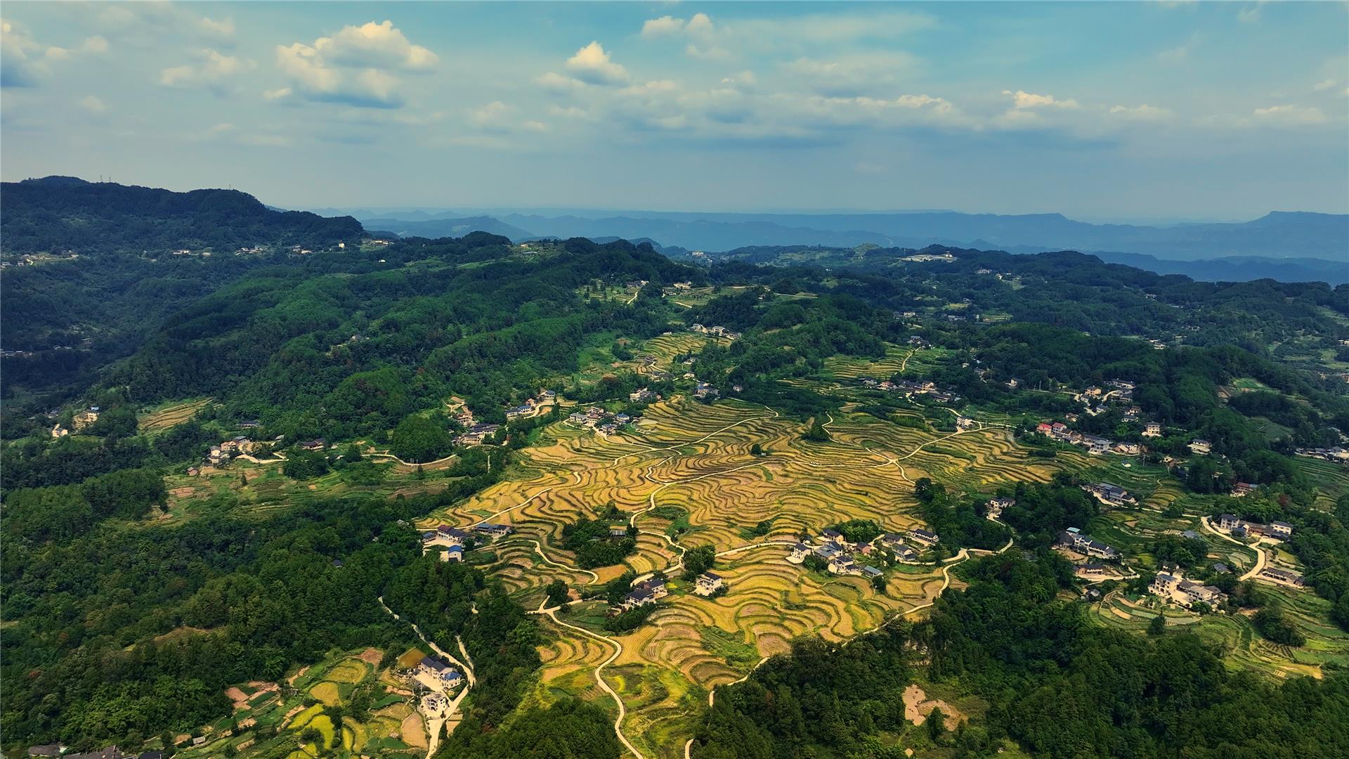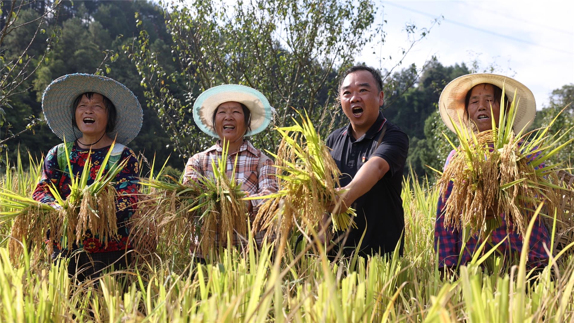 金秋时节,在巴南区石滩镇方斗村的金色稻田里,方斗村驻村工作队队长蔡龙,正带领工作队与村民们一起收割水稻,欢声笑语在田野间回荡。
