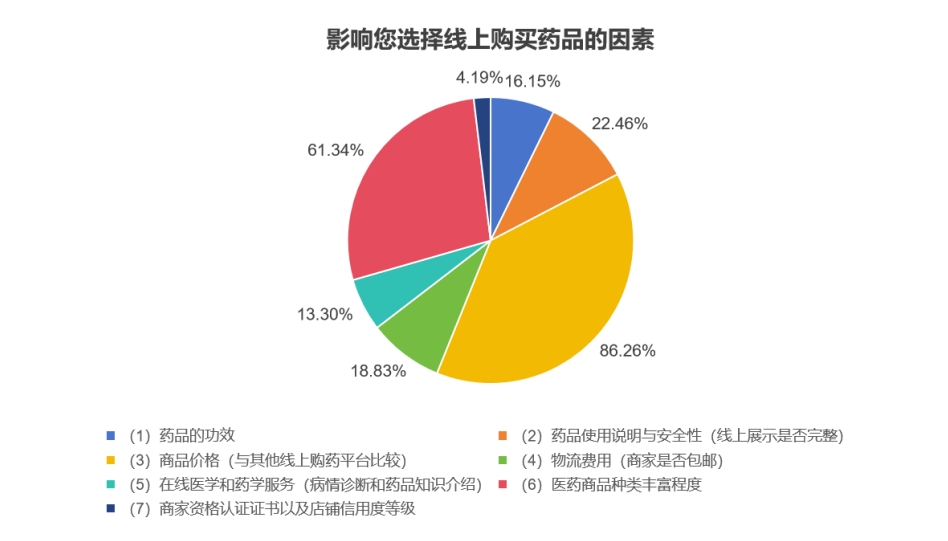 近日,新华网发起了一项《线上购药消费者行为问卷调查》。回收的1800余份问卷结果显示,药品商品价格和药品种类丰富程度成为驱动消费者倾向于线上购买药品的两大核心要素,占比高达86.26%和61.34%;而在影响未选择线上购药的因素调查中,无法辨别网上药店药品的真伪成为消费者最担忧的问题。此外,专业医师在线咨询服务、医保支付的便捷性,以及药品售后服务的保障情况,也同样是消费者在做决定时重点权衡的几大要素。