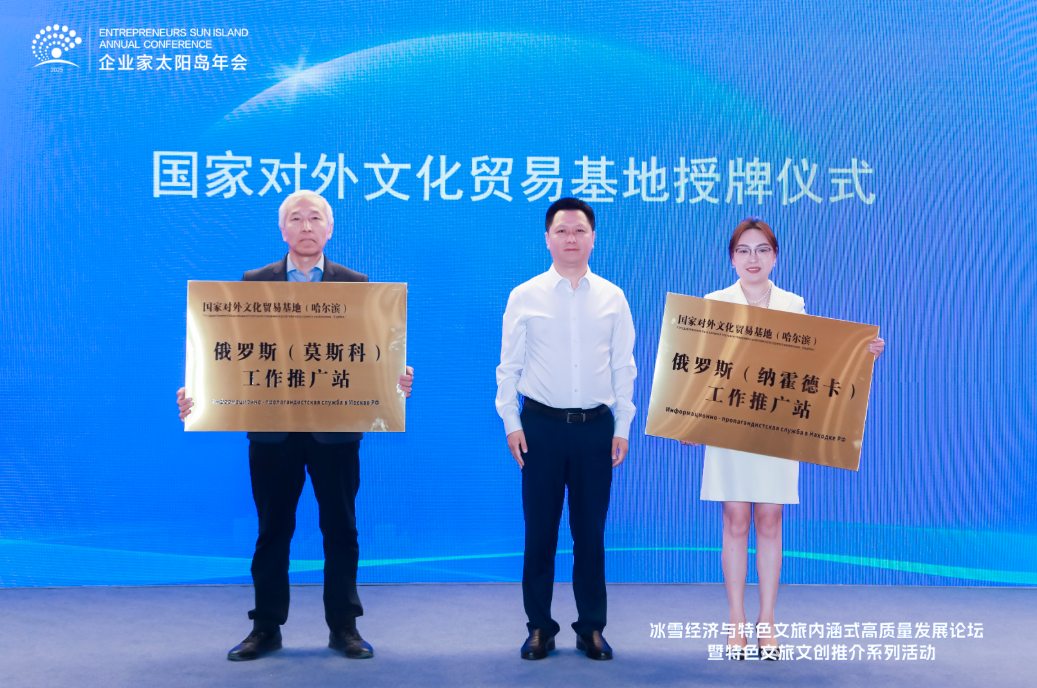 8月2日,2025太阳岛企业家年会“冰雪赋能发展 文旅创引未来”冰雪经济与特色文旅内涵式高质量发展论坛在哈尔滨举行。图为黑龙江省文化和旅游厅副厅长蒋兴成为轩辕集团副董事长王辉授“国家对外文化贸易基地”牌