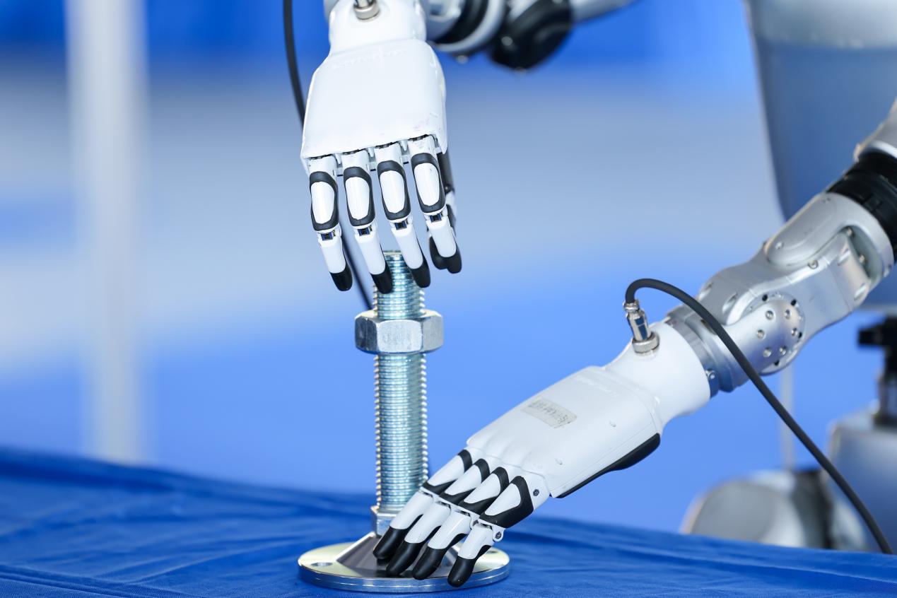 机器人双手协作完成螺栓装配操作。新华网发(大赛组委会供图)