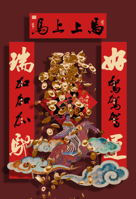 此外,敦煌当代美术馆与汉仪字库联合发布《瑞驰2026春联礼盒》,该礼盒特邀书法家许静创作马年主题春联,青年艺术家华成创作招财纳福版画图,每份联名礼盒均配有唯一专属编码,极具收藏价值。敦煌当代美术馆还与阿那亚社区展开联动合作,将春联作品送至社区13810户居民家中。春联作品从展厅出发,进入生活空间,真正从美术馆延伸至千家万户,与居民共度新春佳节。