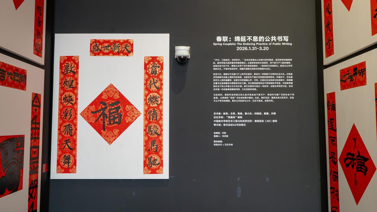 近日,作为“敦煌当代春节季”系列活动之一,春联书法艺术展《春联:绵延不息的公共书写》在敦煌当代美术馆开幕。作为一次具有开创性的策展实践,本次展览首次以跨学科与研究性的策展思路,将春联主题引入当代美术馆语境展开,并结合AI造字、机器人书写与增强现实(AR)互动等技术,拓展传统书写的当代表达路径。展览以春联这一极具公共性的全民文化实践为切入点,邀请多位跨越传统书法与当代艺术领域的创作者,呈现传统文化在当代语境中的可能性。本次展览由敦煌当代美术馆与汉仪字库联合呈现,展期从即日起至3月20日。