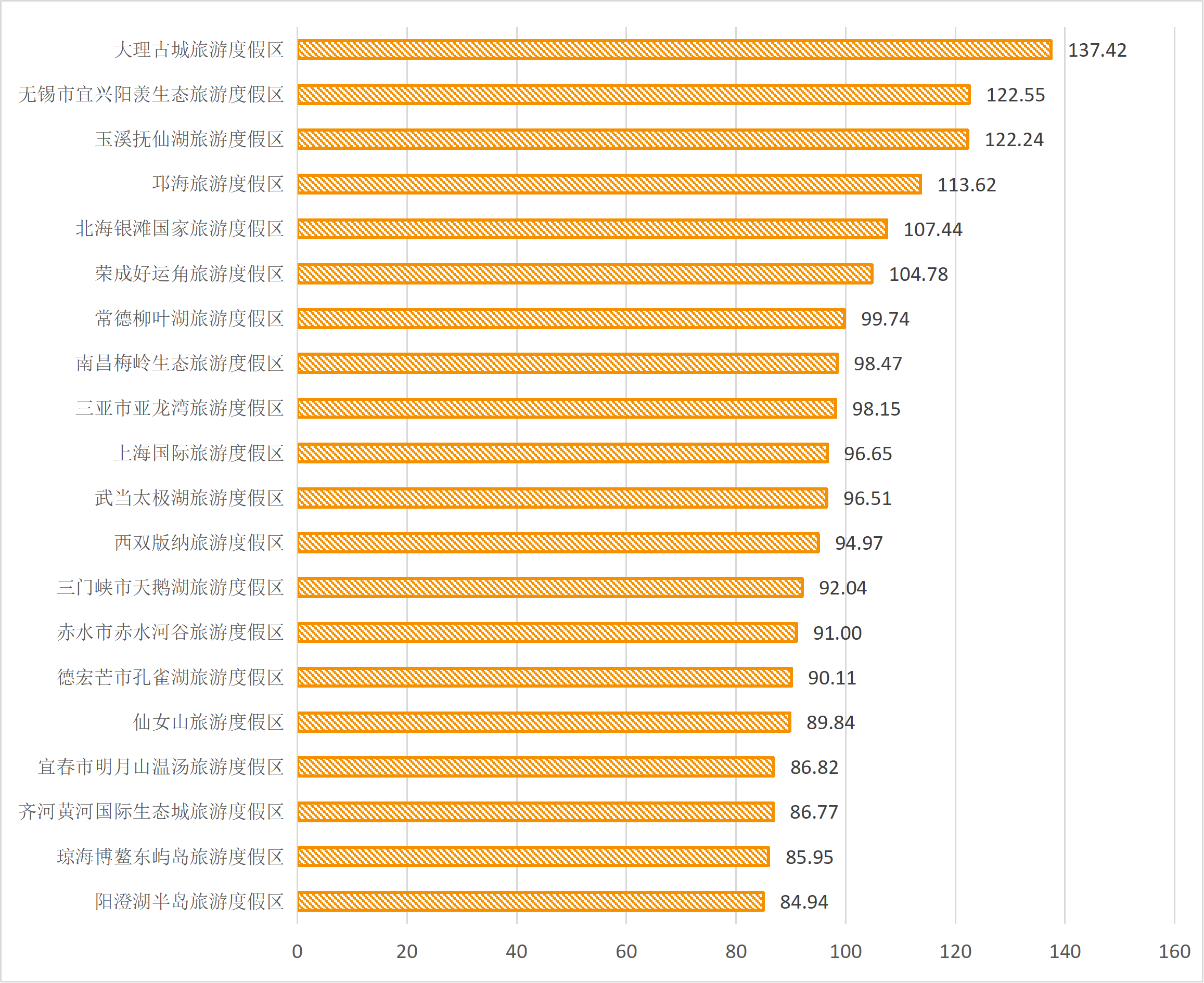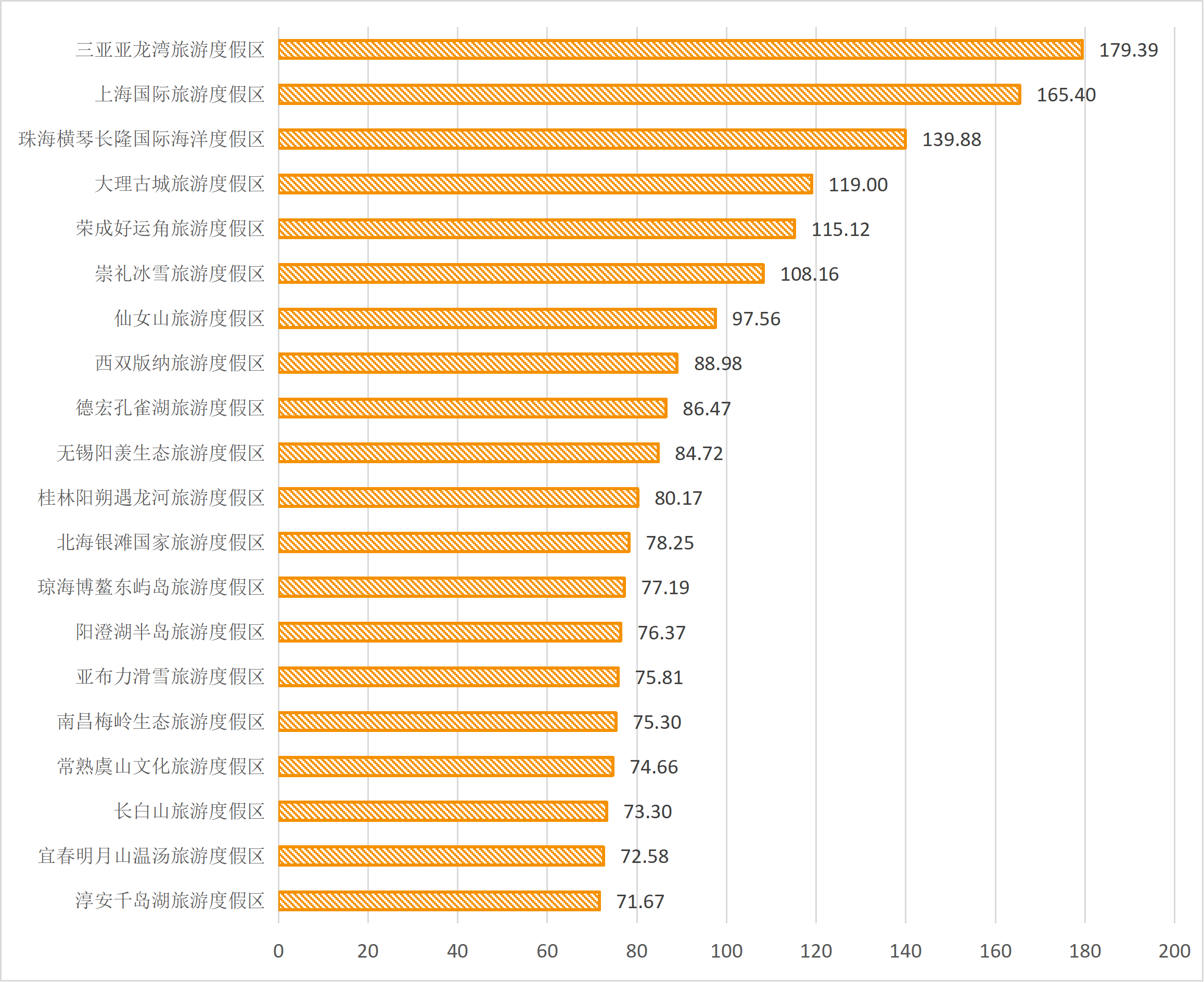 85家国家级旅游度假区共接待深度游客(停留2小时以上)超3300万人,同比增长54%。TOP20度假区平均接待88.6万人,同比增长约54.9%。