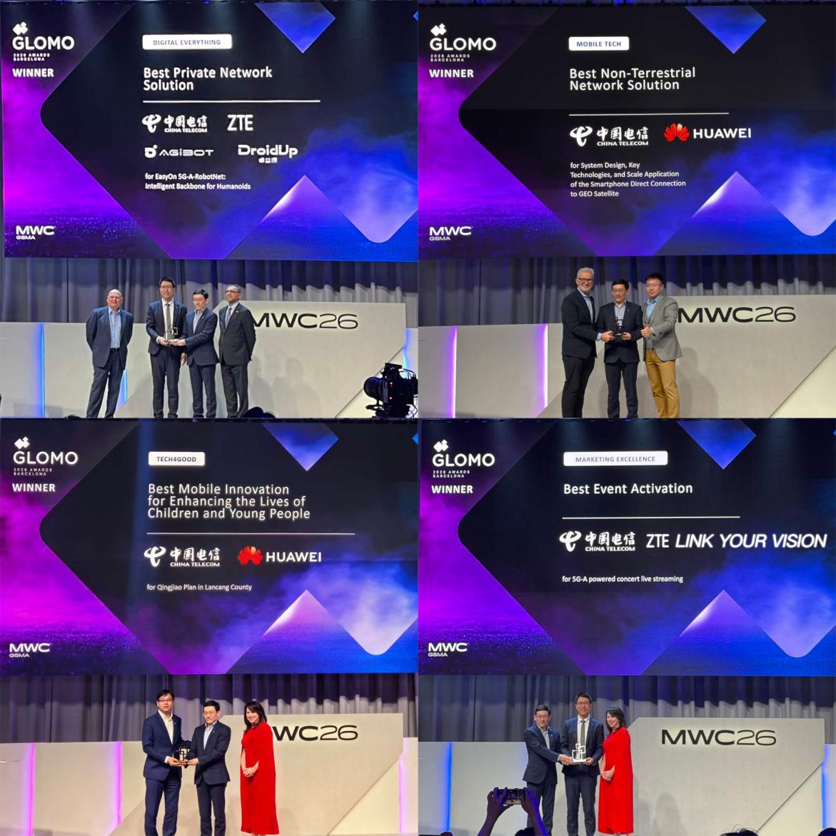 3月4日,在全球移动大奖(GLOMO奖)评选中,中国电信揽获四项大奖。中国电信联合中兴通讯推出的EasyOn 5G-A-RobotNet方案荣获“最佳专用网络解决方案奖”,联合华为研发的手机直连高轨卫星项目荣获“最佳非地面网络解决方案奖”,联合友成基金会、华为共同申报的普洱澜沧拉祜族自治县“青椒计划”荣获“改善儿童和青少年生活的最佳移动创新奖”,联合中兴通讯等产业合作伙伴凭借“5G-A赋能无线新模式演唱会直播”项目荣获“最佳活动营销奖”。多项大奖的揽获,彰显了中国电信在技术创新、社会责任与商业应用等多个维度上的综合实力。