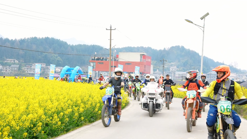 在花海的另一侧,引擎轰鸣声打破了田野的宁静,机车竞技为春日乡村增添了一抹动感与活力。