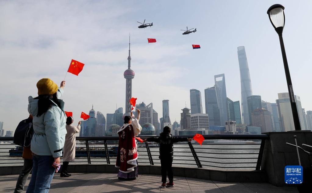 兩架懸掛國旗和警旗的警航直升機飛過上海外灘,慶祝首個“中國人民警察節”(2021年1月10日攝)。新華社記者 方喆 攝