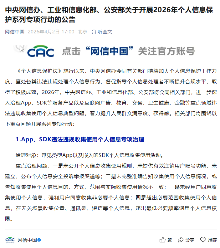 《个人信息保护法》施行以来,中央网信办会同有关部门持续加大个人信息保护工作力度,查处各类违法违规处理个人信息行为,督促指导个人信息处理者不断提升合规水平,取得了积极成效。2026年,中央网信办、工业和信息化部、公安部将会同相关部门,进一步深入治理App、SDK等服务产品以及互联网广告、教育、交通、卫生健康、金融等重点领域违法违规收集使用个人信息典型问题,着力提升人民群众满意度、获得感。相关部门将围绕以下重点问题开展系列专项行动: