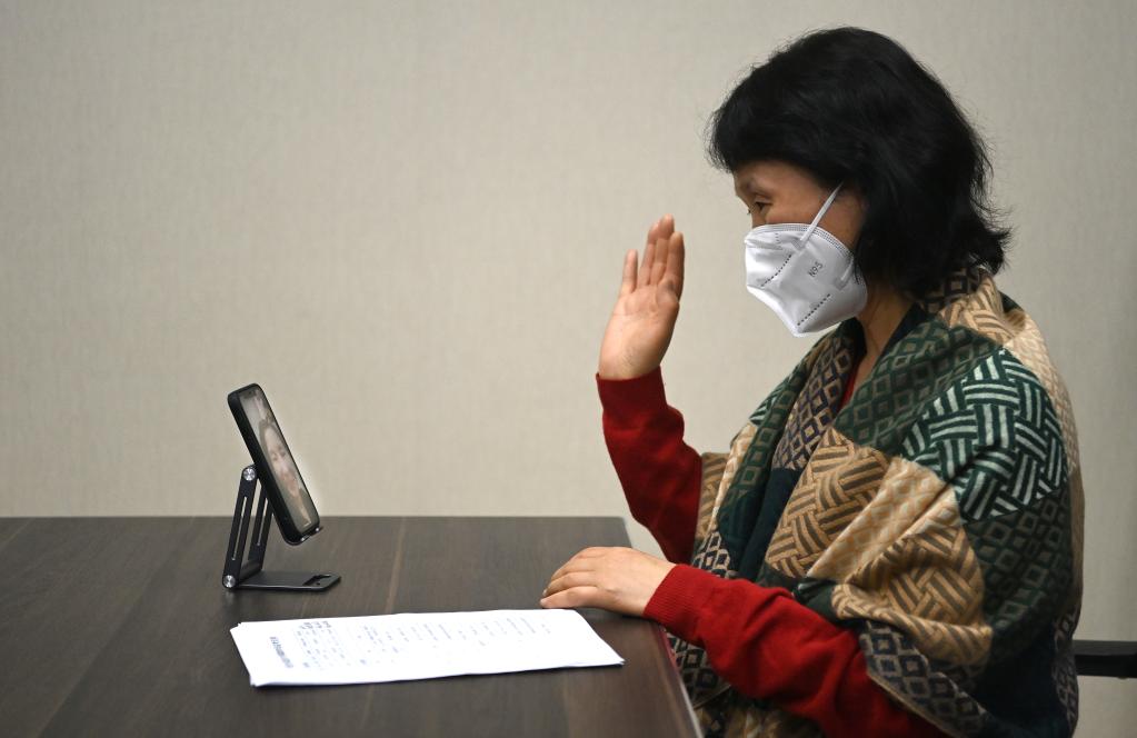 2021年12月24日,西安外國語大學副校長李雪茹與報考西外的隔離考點考生一一視頻,送上慰問和祝福。(新華社記者 劉瀟 攝)
