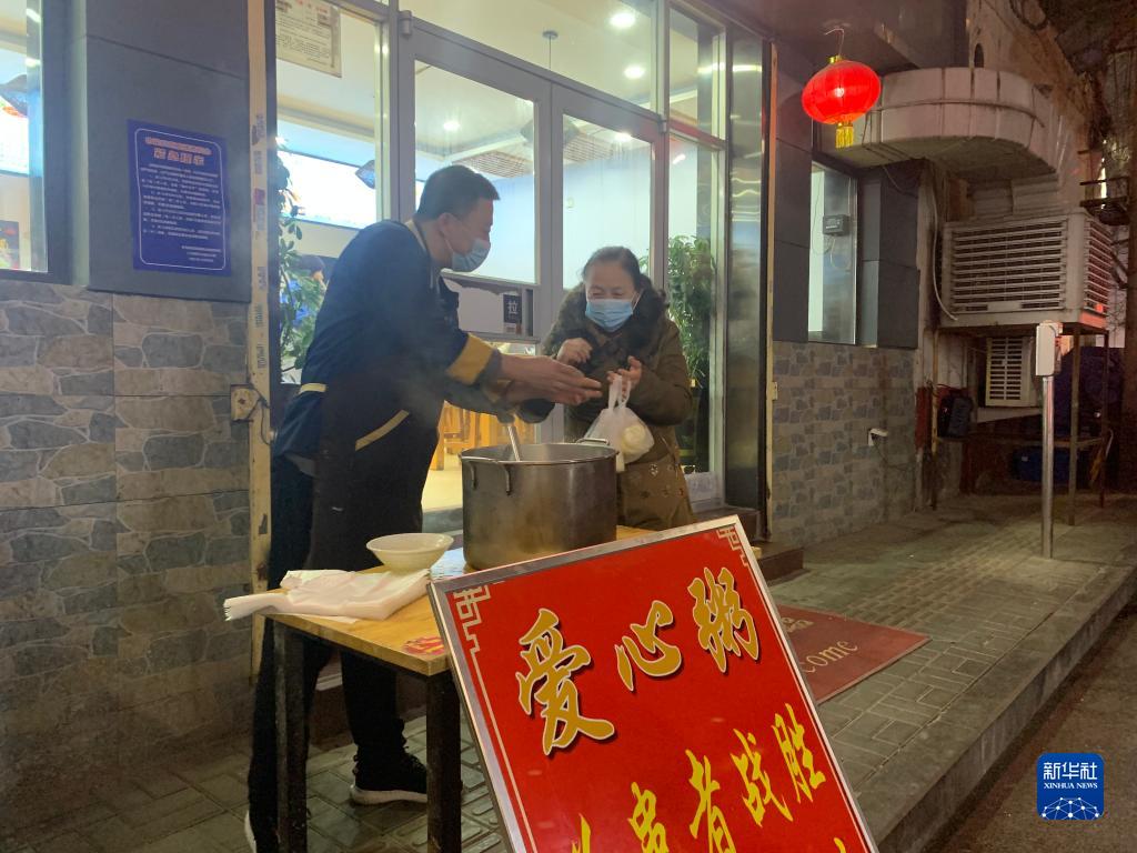 顧客在大強(qiáng)家常菜館外領(lǐng)取愛心粥(1月7日攝)。新華社記者 魏飚 攝