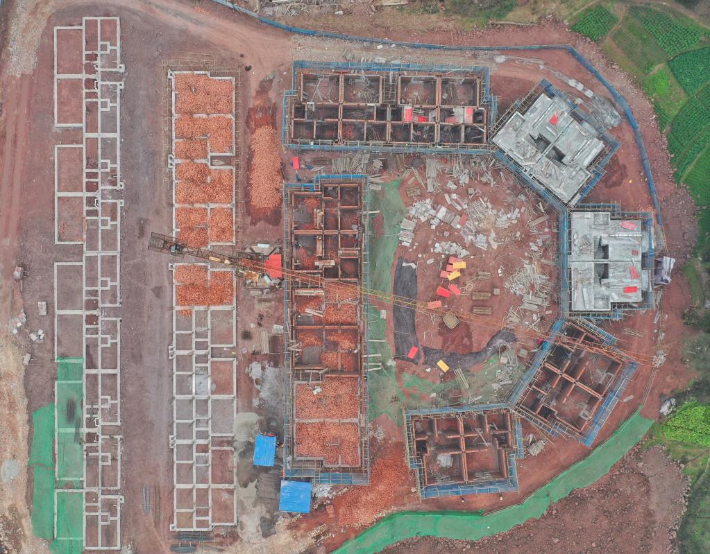 圖為1月20日拍攝的福集鎮魚目村聚居點建設現場(無人機照片)。 新華社記者劉坤 攝