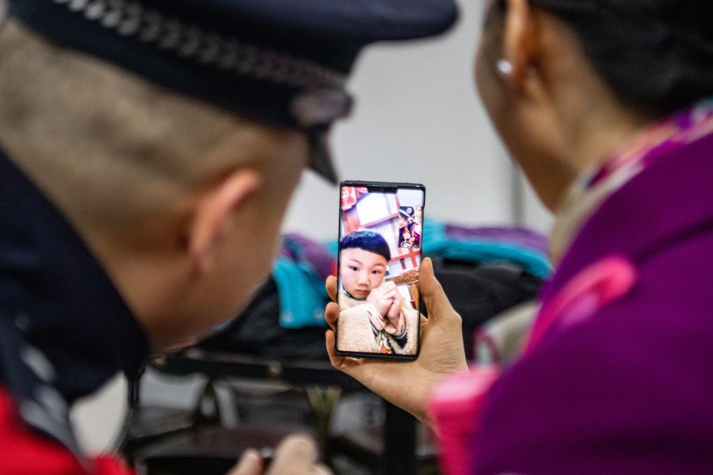 2月15日,祁悅和周幸正在和兒子“豌豆”視頻。 新華社記者 唐奕 攝