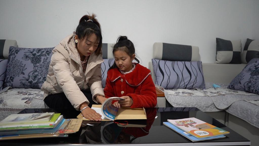 21日晚,尚欣怡和媽媽薛淑琴在新家一起包書皮。(新華社記者郎兵兵 攝)