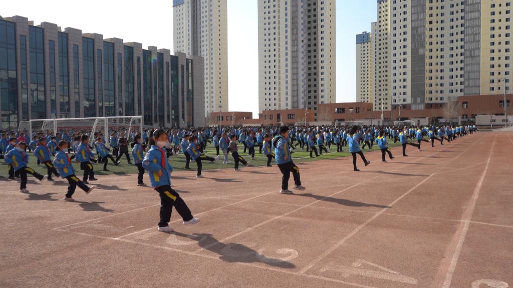 22日,蘭州新區第二小學學生們在操場上做課間操。(新華社記者王紫軒 攝)