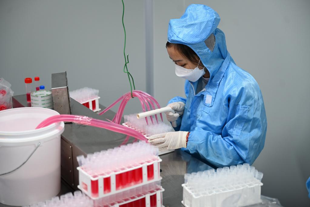 3月16日,美林美邦(廈門)生物科技有限公司員工在分裝滅活型病毒保存液。 新華記者 林善傳 攝