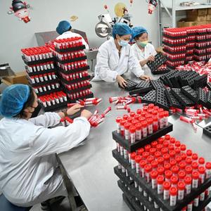 3月16日,位于廈門生物醫藥產業園的美林美邦(廈門)生物科技有限公司的員工在包裝滅活型一次性病毒采樣管。 新華社記者 林善傳 攝