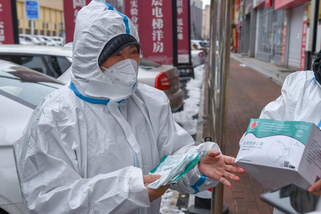 3月18日,吉林市黨員志愿者劉鳳英給社區送防護物資。(新華社記者 張楠攝)
