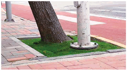 春風(fēng)吹綠新芽,城中的樹木已吐出新綠。但煞風(fēng)景的雜物也不少:電線搭在樹枝上、燈桿插到樹坑里、盲道修到樹根下,特別是在一些老城區(qū),指示牌、郵箱、井蓋等紛紛跟大樹“搶地盤”。