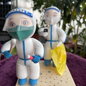 居家隔離的熱心市民創作黏土作品“抗疫大白”,表達對“大白”的贊美與感激。受訪者供圖。