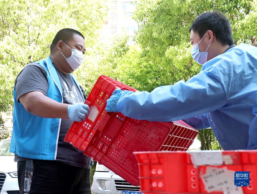 4月17日,李曉俊(左)與志愿者在閔行區(qū)虹梅景苑二街坊卸貨。新華社記者 陳建力 攝