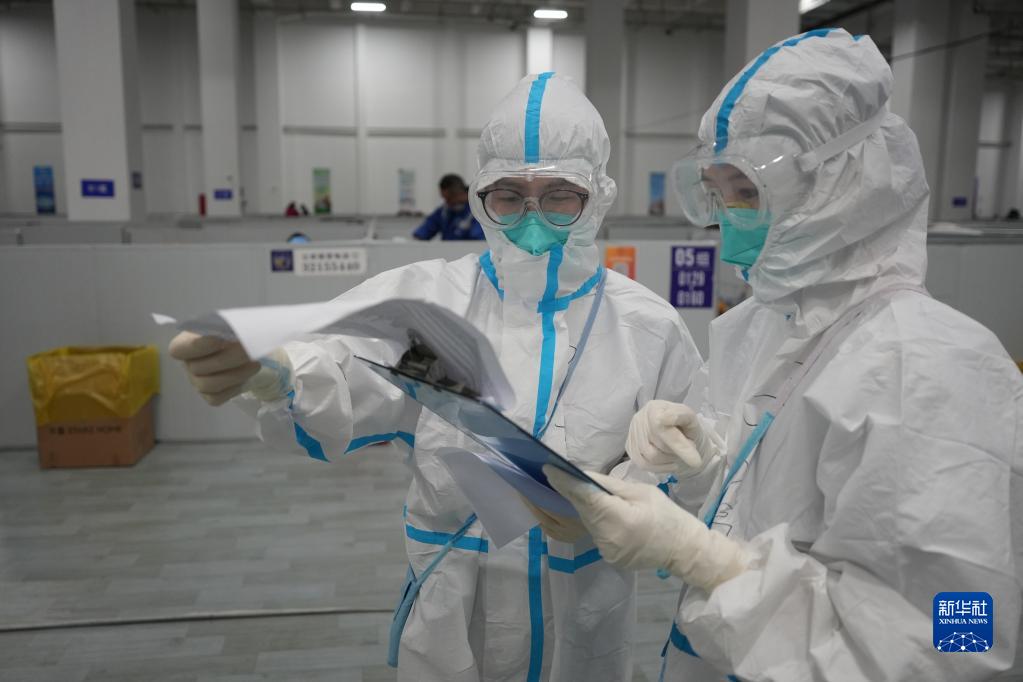 4月16日,醫(yī)護人員在上海臨港方艙醫(yī)院核對患者住院床位。新華社記者 楊有宗 攝