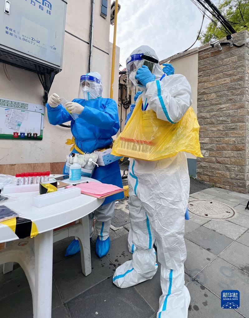 4月16日,長寧區(qū)周家橋街道周一居民區(qū)黨總支書記張振海(右)準備陪同醫(yī)務人員進行上門核酸檢測采樣。新華社發(fā)