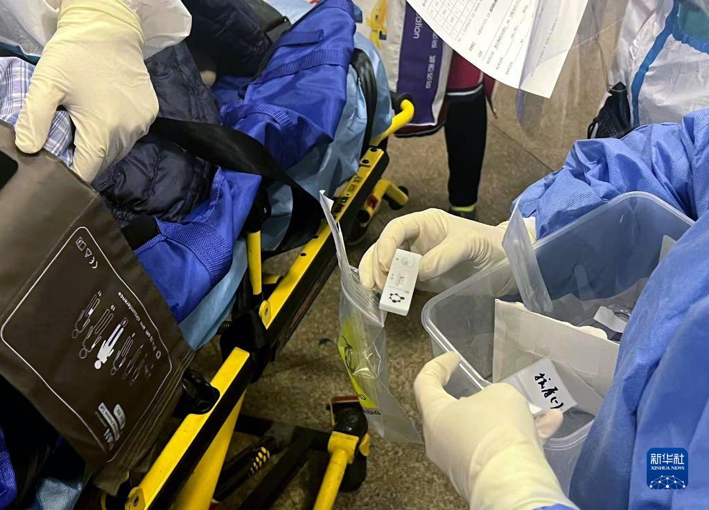 4月16日,復旦大學附屬中山醫(yī)院急診大廳外,醫(yī)護人員為患者進行抗原檢測。新華社記者 袁全 攝