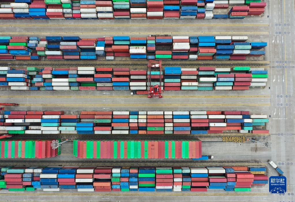 這是4月15日拍攝的上海洋山港集裝箱碼頭(無人機照片)。新華社記者 丁汀 攝