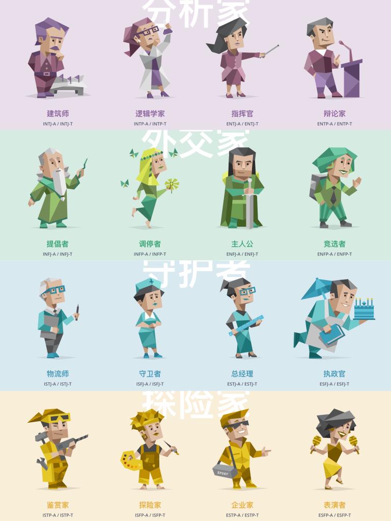 邁爾斯和布里格斯又在此基礎上增加了一個維度:“判斷(J)-知覺(P)”,構成了16種類型,每種類型都用4個字母表示,比如INTJ或ENFP。