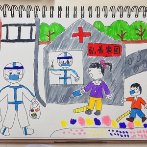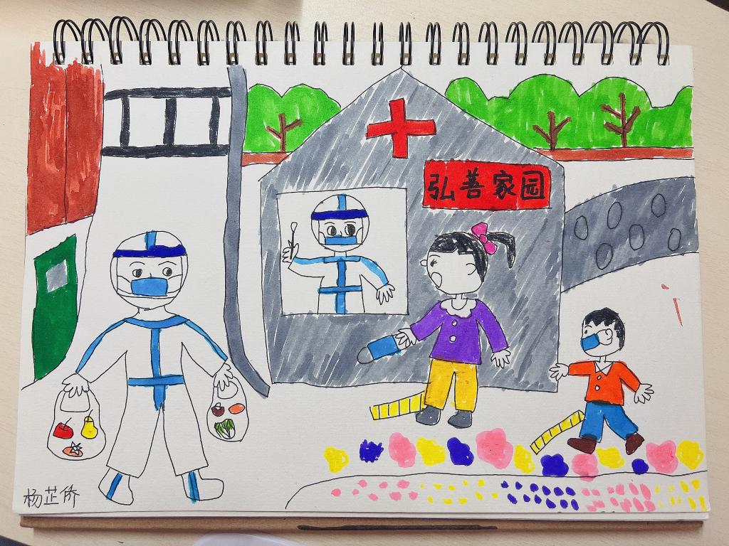 北京市東城區光明幼兒園朝陽分園的幼兒創作的繪畫作品《戰疫情》。(受訪者供圖)